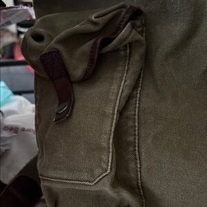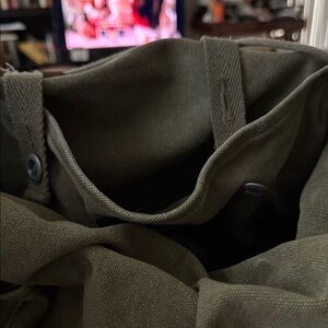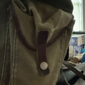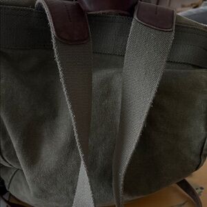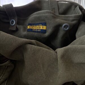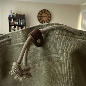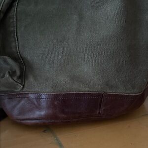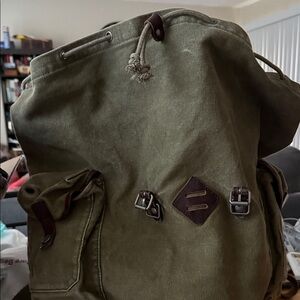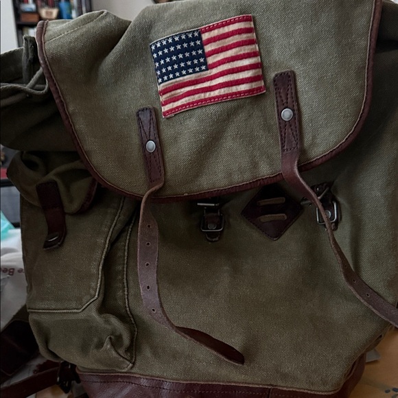 This is a Ralph Lauren backpack/rucksack from their now discontinued Rugby collection. I bought this back in 2011. It’s canvas with leather trim. It has a deep inside with a pocket. The sides also have two pockets perfect for a water bottle. The closure is drawstring and it has two front closures for better security. It’s a great bag and loved. It has no tears and no rips. The base is leather and has been moisturized to keep it from cracking and to keep it in good condition. Ask me anything.