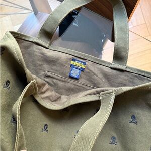 Stylish olive green tote bag featuring a subtle skull pattern. Perfect for everyday use.