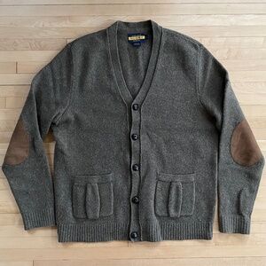 Discontinued Ralph Lauren Rugby label cardigan sweater in 100% wool with leather buttons and suede elbow patches. Has 5 leather knit button closure and 2 pockets on front. Size Large.