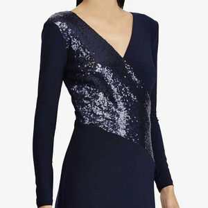 Ralph Lauren Sequined Panel Jersey Stretch Dress Navy Blue Long Sleeve Lined 2