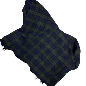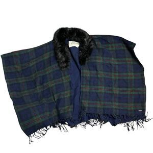 Ralph Lauren Shawl OS Green Tartan Plaid Reversable Ruana Blue Fax Fur Collar