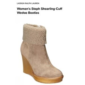 Shearling cuffs add cozy appeal to a stylish wedge lift in the Steph booties from Lauren Ralph Lauren.