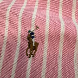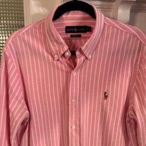 Excellent like new condition. Ralph Lauren pink and white striped knit oxford shirt. Long sleeves, button down collar, 100% cotton. Mens size large. See photos for measurements MSRP $139
