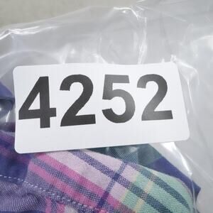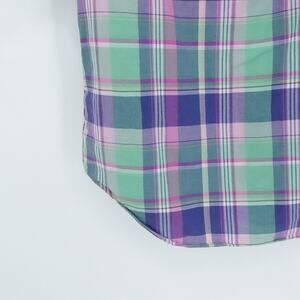 Classic fit, short sleeve, button-down collar, multicolor plaid (green, purple, pink, blue).