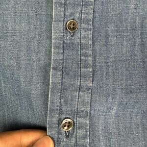 No holes or stains, small fabric pull on the back. Buttons has some wear/chipping, but not broken. Kind of lightweight so I would say its closer to chambray than denim. Color is slightly darker in person.