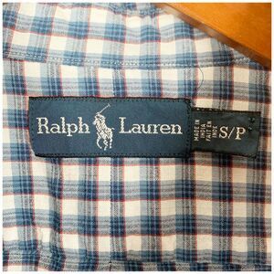 A nice Ralph Lauren button front shirt, blue and white plaid/checks. It's size Small. It has a button down collar, button on back of collar and back pleat. Embroidered pony on chest. Short sleeves. 100% cotton fabric. No pocket. Gently preowned.