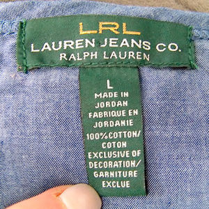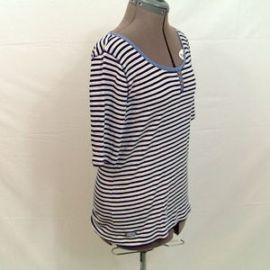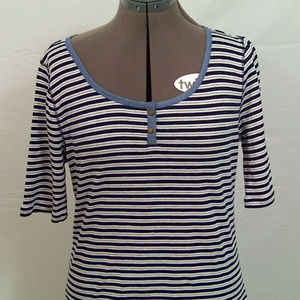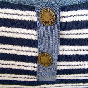 Very nice Navy Blue and White Striped Tshirt from Ralph Lauren, this shirt is in like new condition. This shirt has 2 antiqued brass buttons with Ralph Lauren stamped onto them and the collar has been piped with a nice blue contrasting fabric.