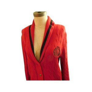 This Ralph Lauren cardigan sweater combines classic style with warmth and comfort. With a red and black cableknit pattern, it's perfect for adding a touch of elegance to any outfit. Ideal for casual or semi-formal occasions. Button down front, fold over lapels, thick cotton cableknit fabric, crest logo on chest, long sleeves and great classic sweater