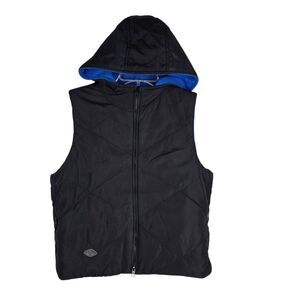 The Ralph Lauren Quilted Puffer Hooded Vest in black with blue fleece lining M is a stylish and practical outerwear piece for women. Made from 100% nylon with a 100% polyester lining, this sleeveless vest features a zip closure and quilted accents. It is designed for travel and casual occasions, with a hood for added warmth and pockets for convenience. Perfect for winter, fall, and spring, this vintage vest combines classic style with a touch of outdoor utility, making it a versatile addition to any wardrobe.