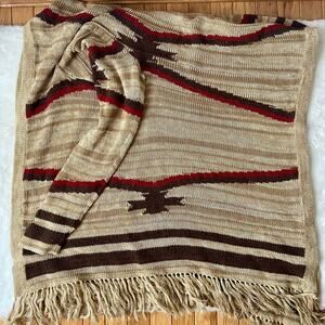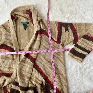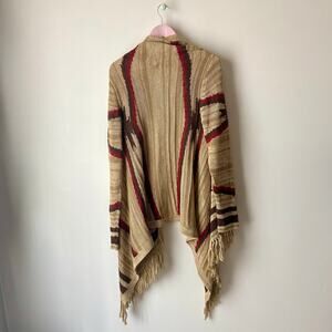 Tan linen, cotton, and wool blend waterfall front cardigan by Lauren Jeans Company with red and brown stripes and a fringe hem. Amazing quality and great condition. Size L/XL. Measurements in photos.