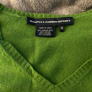Beautiful Ralph Lauren Sport women's size XS wool blend v-neck sweater in excellent used condition. No tears/stains. 38% Merino wool, 38% nylon, 25% viscose, 9% cashmere.