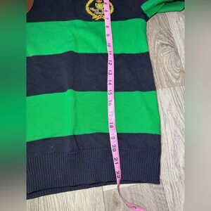 Stylish green and black striped sweater featuring a unique patch detail on the shoulder.