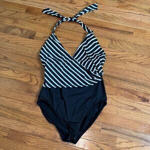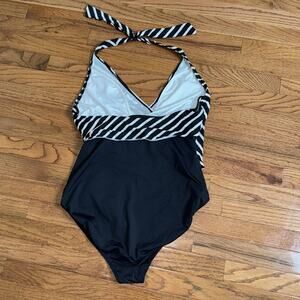 Ralph Lauren Striped Halter Tummy Control 1 Piece Swim Suit Black White Size 16
