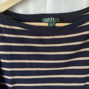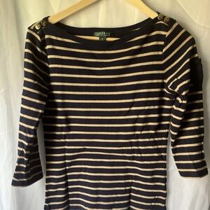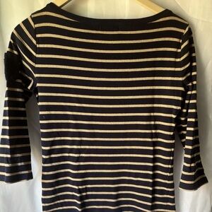 Elegant navy and beige stripes. Gold button details on shoulders. Three-quarter sleeves. Timeless style.
