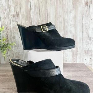 These shoes are in excellent condition, except there is peeling on the inside of the clogs from sitting. A classic clog in black suede with gold buckle detail. Size 8.5