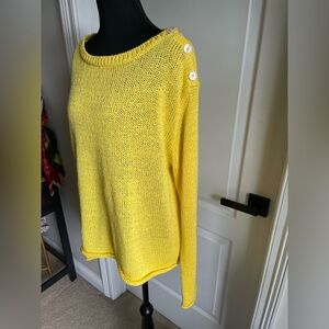 Bright yellow sweater with scoop neck. Button accents on shoulder. Perfect for everyday style.