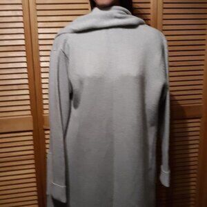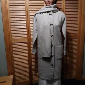 Sweater Coat with attached Scarf by Ralph Lauren Size is Petite Small Materials are 60% Merino Wool, 15% Angora Rabbit Hair, 15% Cashmere and 10% Nylon This sweater was never worn yet There is a tiny flaw in the sweater up by shoulder area as shown by the last 3 photos. Measurements: Neck to bottom 38" Sleeve 18" + 2 1/2" with cuff rolled down Armpit to Armpit measured on back 21".