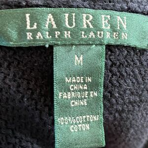 The black sweater features a solid pattern with the Ralph Lauren logo as an accent. It is machine washable and made of 100% cotton, ensuring both comfort and durability. This preppy pullover is a regular fit, size medium, and is suitable for women.
