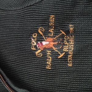 -Polo zip sweater jacket with embroidered crest. Has small hole on right arm (can easily be mended). Has zip pockets as well. Good used condition.