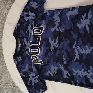 -Blue camouflage short sleeve polo shirt. Excellent used condition!