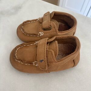 Stylish baby walker shoes. Soft tan leather. Easy Velcro strap. Perfect for infants.