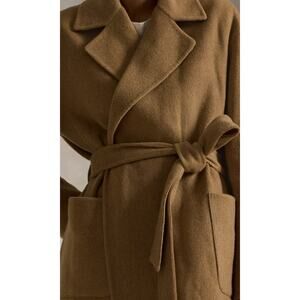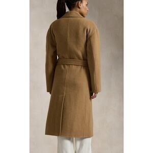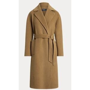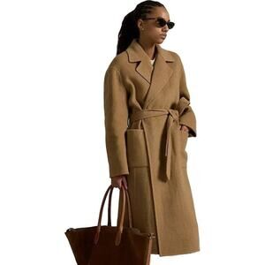 Elegant tan coat with a belted waist. Classic design by Ralph Lauren. Perfect for a sophisticated look.