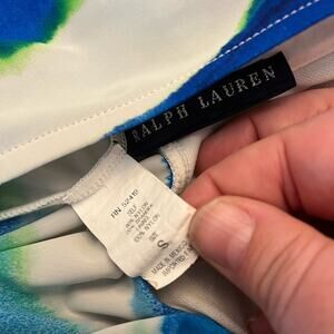 Ralph Lauren bandeau tankini top. Gold ring at top connects to halter strap. Green, blue and white striped. Size S