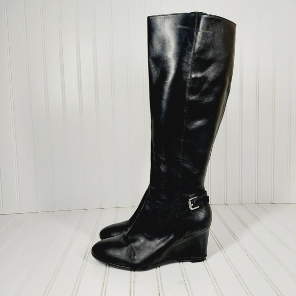 Ralph Lauren Tia Black Leather Side Zip Buckle Detail Wedge Heeled Boots I31