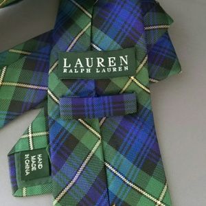 Purple ,blue, black ,green and tan pinstripe Ralph Laurens tie pairs perfectly with pleated Ralph Lauren slacks