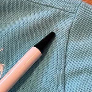 Chic turquoise polo with iconic logo pattern. On the smaller side, might be kid sized. Small spot near sleeve seam, pictured. Some fading from washing. All items from a dog friendly, smoke free home and ship next biz day.