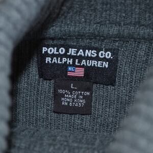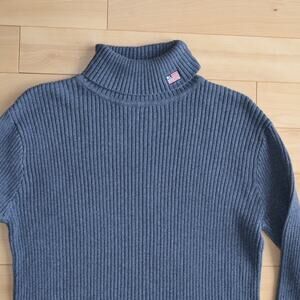 Elevate your wardrobe with this classic Ralph Lauren turtleneck sweater. In a versatile gray, this ribbed sweater is perfect for layering or wearing on its own. The soft knit provides warmth and comfort, making it ideal for cooler weather. RL American flag detail. Polo Jeans Co. label.