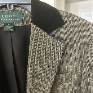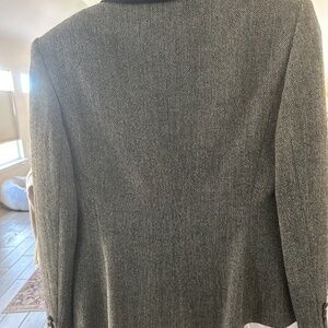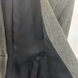 Brand new, herringbone of black, grey, and cream. Front pockets and chest pocket. One button closure, buttons on cuff. Collar is black velour. Beautiful jacket. Excellent condition