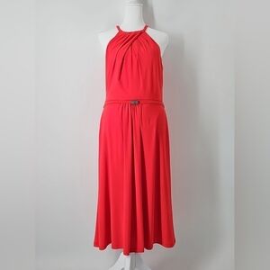 Ralph Lauren Twisted Halter Neckline Flowy Dress Vibrant Red Belted w Crystal