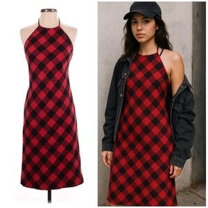 Ralph Lauren Vintage Halter Dress 90s Red Black Buffalo Plaid Check Wool 4 XS S