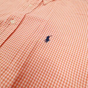 This Ralph Lauren Blake button-up shirt is a classic addition to any wardrobe. The orange and white gingham check pattern adds a touch of vintage style, while the long sleeves and collared neckline make it suitable for both casual and workwear occasions. The shirt is made of woven cotton fabric and is machine washable for easy care. It features a button-down collar style and button closure, with accents and features suitable for all seasons. The shirt is size XL and has a regular fit, making it suitable for most men.