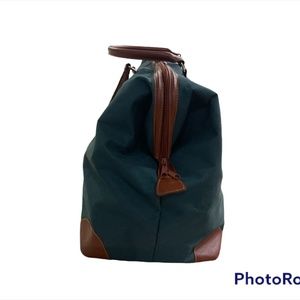 Weekender bag. Beautiful green with brown accents. Vintage. Doctor bag opening which makes the opening very large. Useful to organize and stuff items in the bag. Bottom a plastic bottom so it holds it shape on the bottom. Leather handles. Large bag. 13" height 19" width.