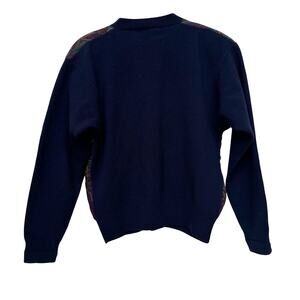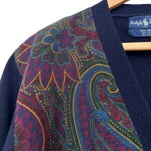 Add a timeless touch to your wardrobe with this rare Ralph Lauren vintage cardigan. Made from 100% wool, this luxurious piece features a striking paisley print on the front panel, contrasted with deep navy knit sleeves and back.