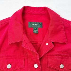 Lauren Ralph Lauren jacket, vintage denim jacket, Y2K cropped jacket, red jean jacket, retro style, casual streetwear, classic fit, preppy fashion, early 2000s, timeless wardrobe, cotton denim, everyday outerwear, bold color, throwback look, trendy layering piece.