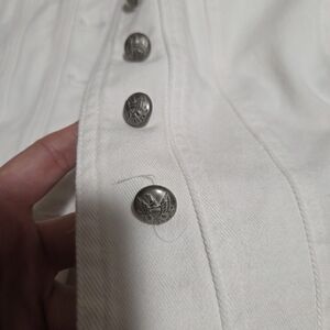 Stylish white jean jacket. Features button-up front. Classic design by Ralph Lauren.