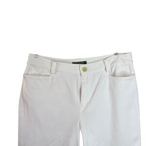 Elevate your everyday style with these crisp Ralph Lauren white pants, size 6. Made from a smooth cotton-blend fabric with stretch for comfort, these trousers feature a clean, tailored silhouette with a mid-rise waist, straight leg, and button-zip closure.