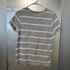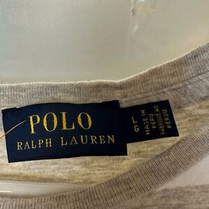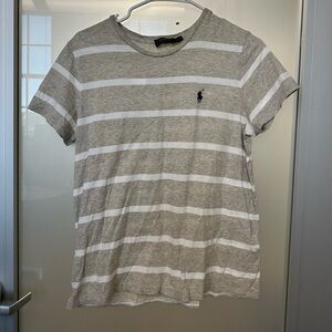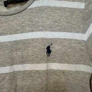 This is a Ralph Lauren women's top in size large. It is gray/beige with a striped pattern and features an embroidered pony logo in black. The shirt has a round neck and short sleeves.
