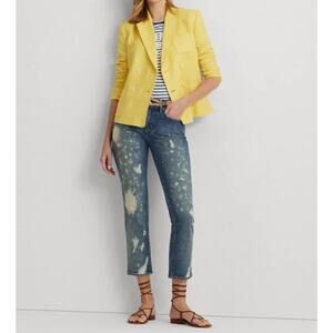The product is a pair of Ralph Lauren Women's Jeans in size 4, featuring a bleach splattered design in a preppy artsy style. Made from a cotton blend denim fabric with a mid-rise and ankle length, these jeans have a 5-pocket design with a zip closure. The exterior color is blue, with a stretch feature for added comfort and flexibility. Perfect for all seasons, these jeans from the Lauren Ralph Lauren brand are a stylish addition to any wardrobe, blending a touch of preppy charm with a modern twist.