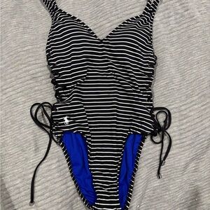 This stylish Ralph Lauren Women’s one piece features a classic black and white striped design with a vibrant blue interior. Perfect for a day at the beach or pool. Sizing tag is cut off but looks like it would fit a medium or large!