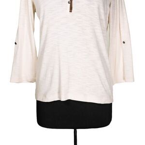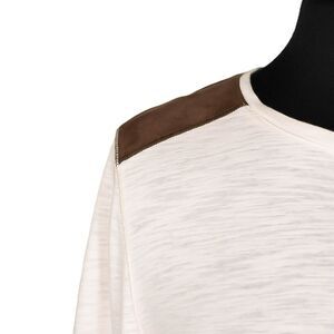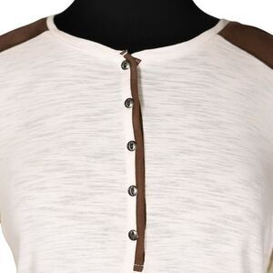 Ralph Lauren Womens Blouse Beige Brown Faux Leather Button 3/4 Sleeve Knit Top L