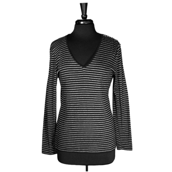 Ralph Lauren Womens Blouse Black Silver Striped Metallic Button Knit Top Size XL