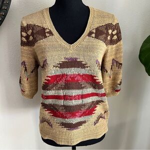 Ralph Lauren Women’s Hand Knit Southwest Short Puff Sleeve, Silk Linen Blend, V-Neck Sweater Jumper in Tan, Brown, Red, Turquoise, Purple in wonderful pre-owned condition. Size: Large. No holes or stains.