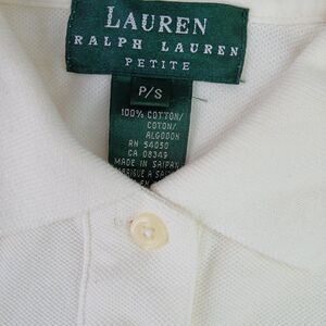 This Ralph Lauren Women's Ivory Short Sleeve Polo Shirt in size PS features a classic fit, collared neckline, and button closure. Made from 100% cotton, it is perfect for various occasions such as travel, casual wear, or business events. The shirt is adorned with a gold crest crown logo, adding a touch of elegance. With a timeless and preppy style reminiscent of the 80s and 90s, this polo is suitable for all seasons, making it a versatile addition to any woman's wardrobe.