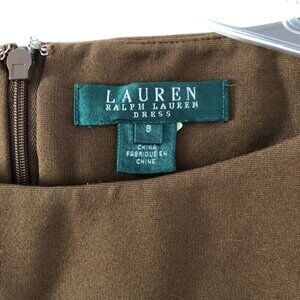 The Ralph Lauren Women's Sheath Dress in size 8 features a stylish colorblock design in black and brown. This long-sleeve dress has a boat neck neckline, zip closure, and is made of a blend of spandex, nylon, polyamide, and viscose. The knee-length dress is suitable for various occasions such as parties, formal events, workwear, and business meetings. With its classic sheath style and timeless brand, this dress is perfect for any season.