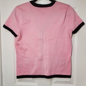 Stylish pink short sleeve sweater featuring elegant black trim. Perfect for a chic and comfortable look.