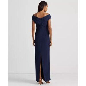 Smooth, delicate crepe creates a body-hugging silhouette in this statuesque Lauren Ralph Lauren gown, which is designed with an overlapping off-the-shoulder neckline for a style that is equal parts alluring and sophisticated.